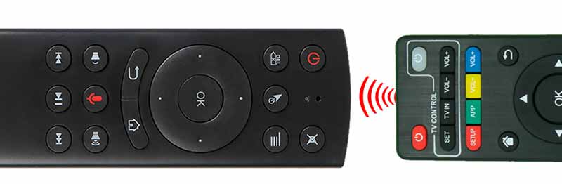 2) Удерживайте воздушную мышь G20S и пульт дистанционного управления (с которого нужно скопировать функцию) инфракрасными приемниками друг против друга и нажмите кнопку на обычном ИК пульте, функцию которой нужно передать (например, функцию выключения Андроид приставки). При успешном приеме кода светодиод загорится, затем начнет мигать.